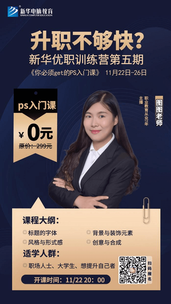 別慌!新華優職訓練營作為帶領PS小白快速上手的專業入門級必修課,經過前四期的積淀,已然成熟!11月22日起,每晚8點,新華優職訓練營第五期《你必須get的PS入門課》正式上線!