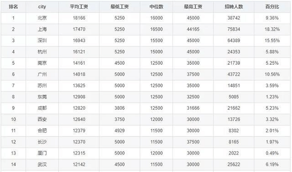 薪資排在前三名的依舊是北京、上海和深圳,平均工資分別為18166元、17470元和16943元,最高工資4.5w,分別是北京、深圳和杭州。
