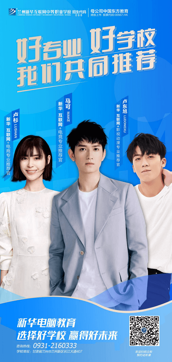 他是馬可,是《家有兒女》里的“狂野男孩”,小小年紀便家喻戶曉,后來《花千骨》里的“殺姐姐”讓他再次備受關注;她是盧杉,因出演《楚留香新傳》而嶄露頭角,更是大爆劇《瑯琊榜》里的“靖王妃”,聰明伶俐、端莊大氣;他是盧東旭,是《我的蓋世英雄》里的陽光大男孩,也是《百里挑一》中的無畏少年。他們雖同為演員,卻本無交集,現在他們擁有了一個共同的身份——新華電腦教育專業推薦官!